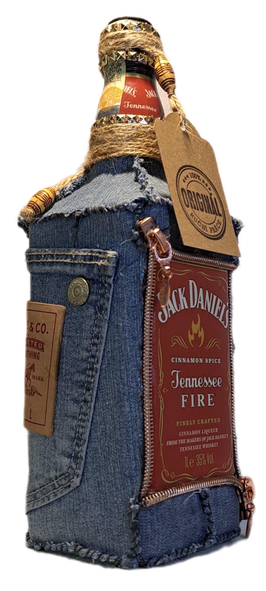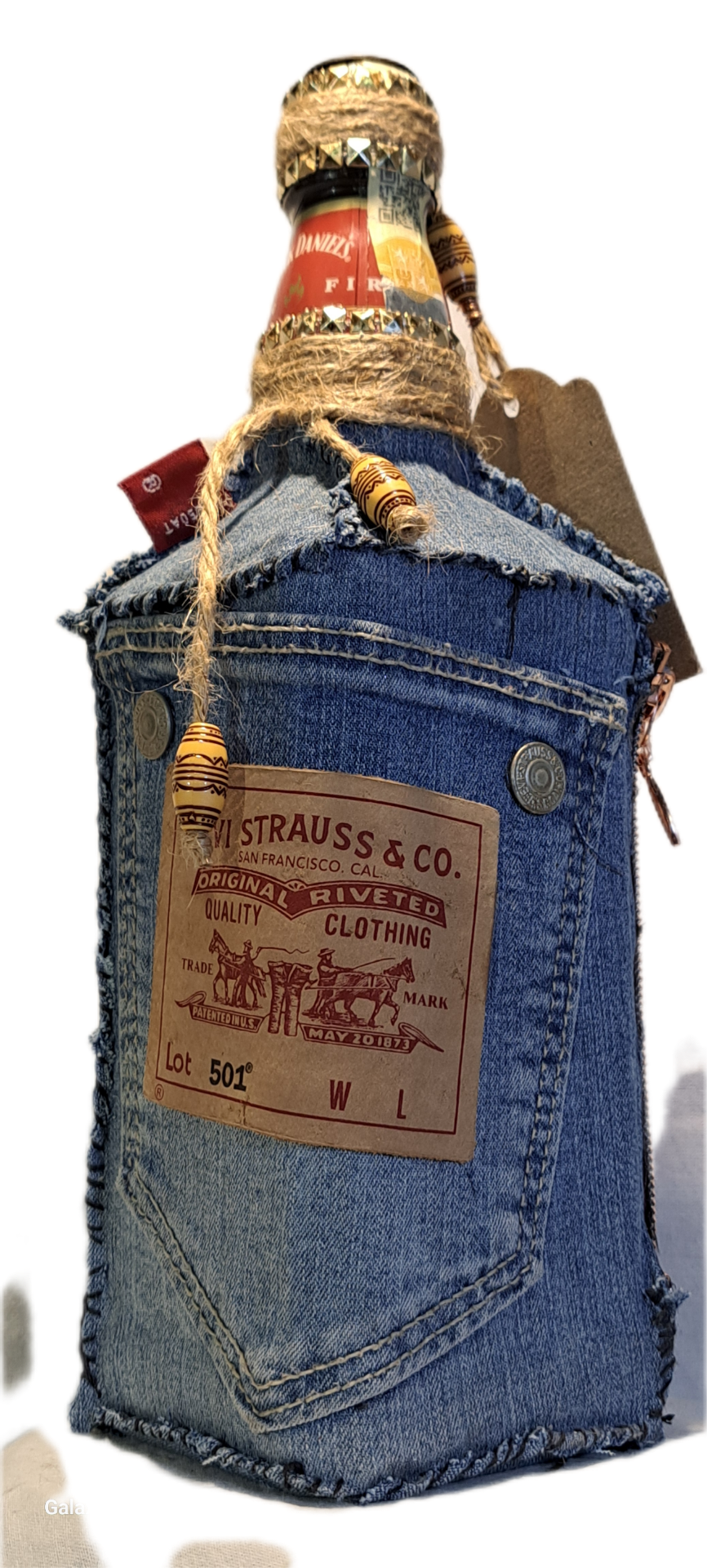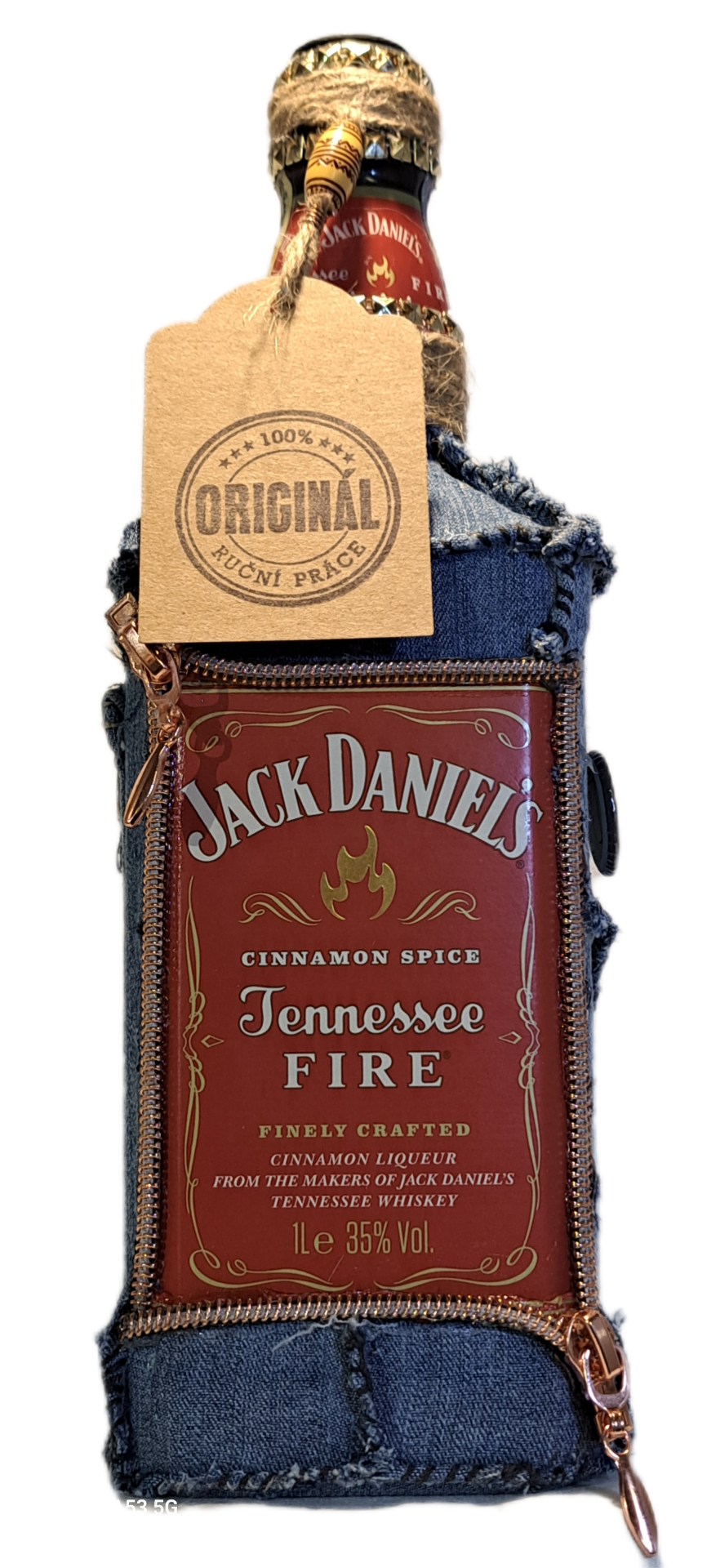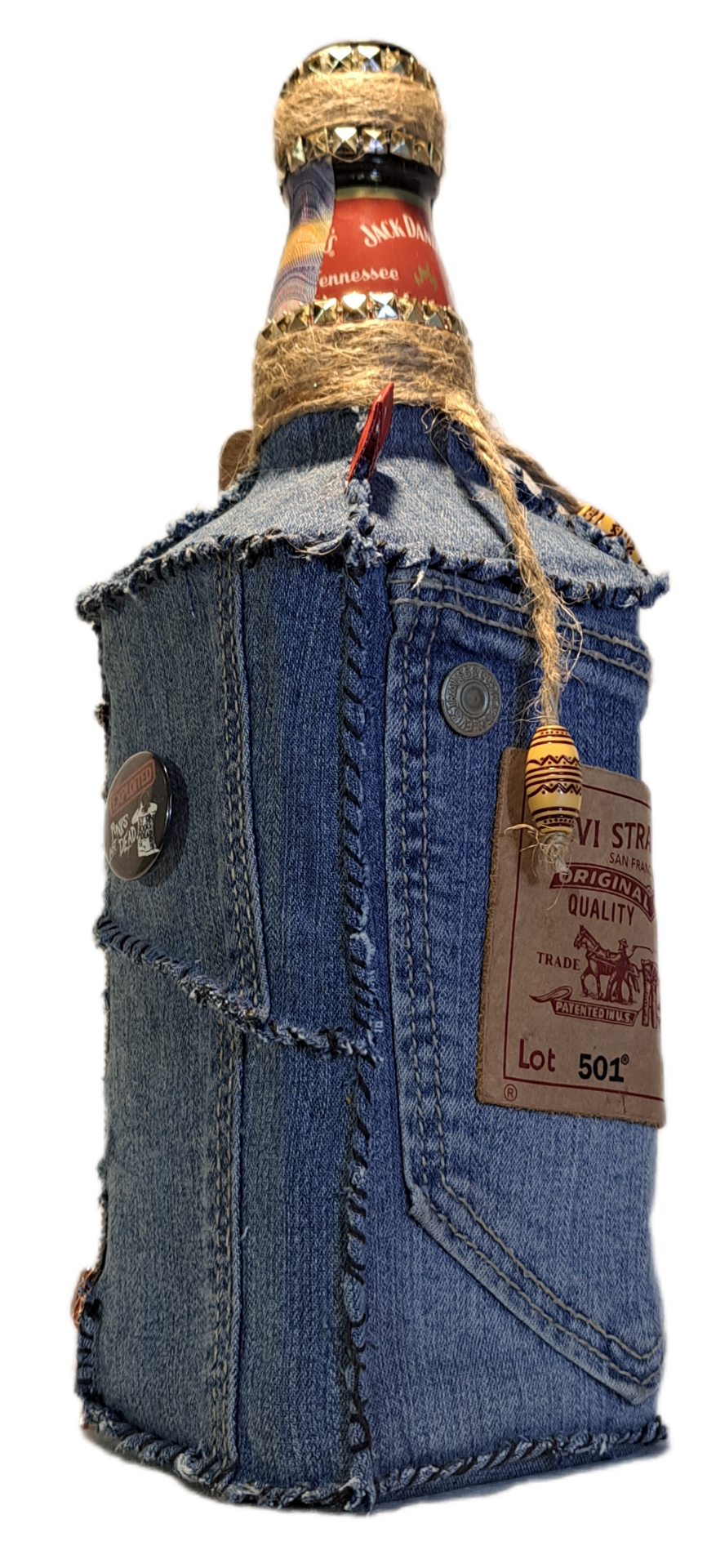 Láhev "oblečená" do jeansového otfitu. Vhodný dárek pro muže.