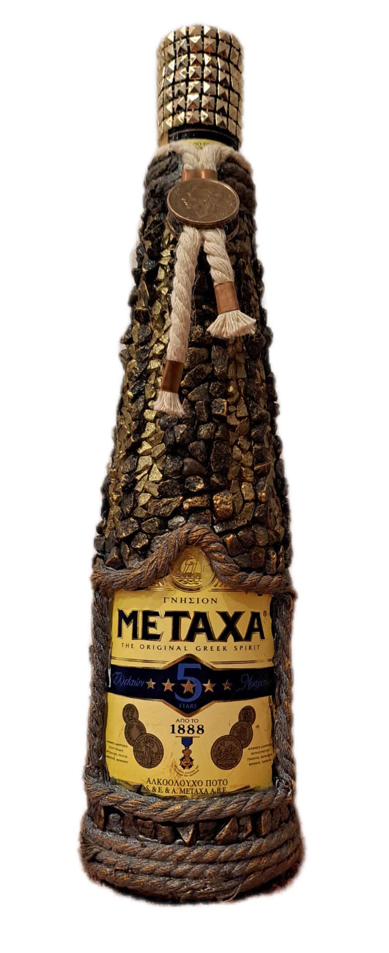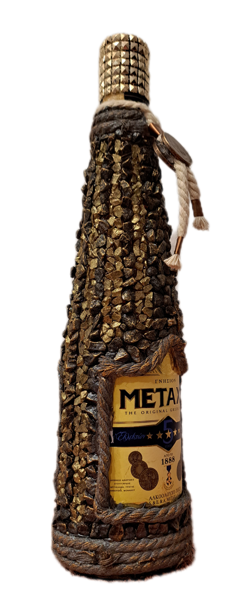 Láhev Metaxy osazena do kamenů.